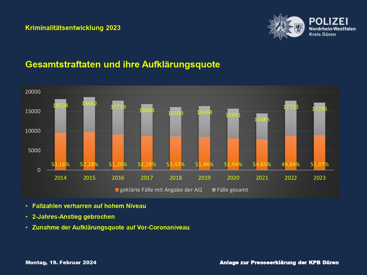 Im Jahr 2023 wurden im Kreis Düren 17.236 Delikte registriert. Im Vergleich zum Vorjahr sind dies 487 Delikte weniger. Die Aufklärungsquote stieg im letzten Jahr um 2,13% auf 51,97% an. Dies entspricht dem Vor-Corona-Niveau von 2019. In 2023 gab es neun Straftaten gegen das Leben. Diese konnten vollumfänglich aufgeklärt werden. Weniger erfreulich sind die Entwicklungen der Straftaten gegen die sexuelle Selbstbestimmung. Zwar konnte auch in diesem Deliktsbereich der seit sechs Jahren bestehende, kontinuierliche Fallzahlenanstieg von zuletzt 412 Fällen auf nunmehr 341 Fälle unterbrochen werden, dennoch befinden sich diese weiterhin auf einem hohen Niveau.